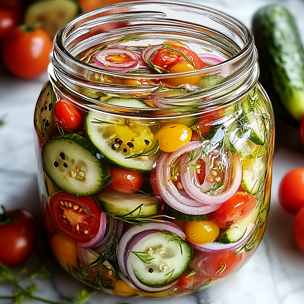 La recette de tomates cerises, oignons rouges, et concombres marinés est une façon simple et savoureuse de transformer vos légumes en un accompagnement croquant et délicieux. Que ce soit pour agrémenter un plat principal, ajouter de la texture à un sandwich, ou simplement pour grignoter, ces légumes marinés sont une excellente option. Avec peu de calories par portion, ils sont également une alternative saine aux condiments plus caloriques. Alors, n’hésitez pas à essayer cette recette et à la personnaliser selon vos goûts !