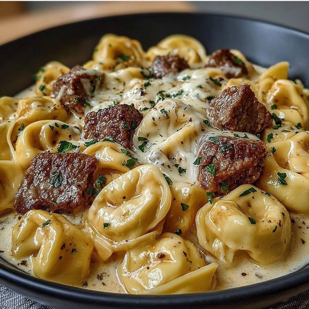 La texture obtenue est riche et harmonieuse. Les tortellinis libèrent la douceur du fromage fondu, la viande de bœuf conserve son goût puissant et légèrement grillé, la sauce crème et parmesan enveloppe le tout d’une onctuosité réconfortante. Le plat se présente idéalement dans des assiettes creuses chauffées au préalable pour maintenir la chaleur. La portion par personne correspond environ à quatre vingt dix grammes de tortellinis, soixante grammes de steak et cinquante millilitres de sauce, ce qui assure un équilibre parfait entre féculent, protéine et sauce.