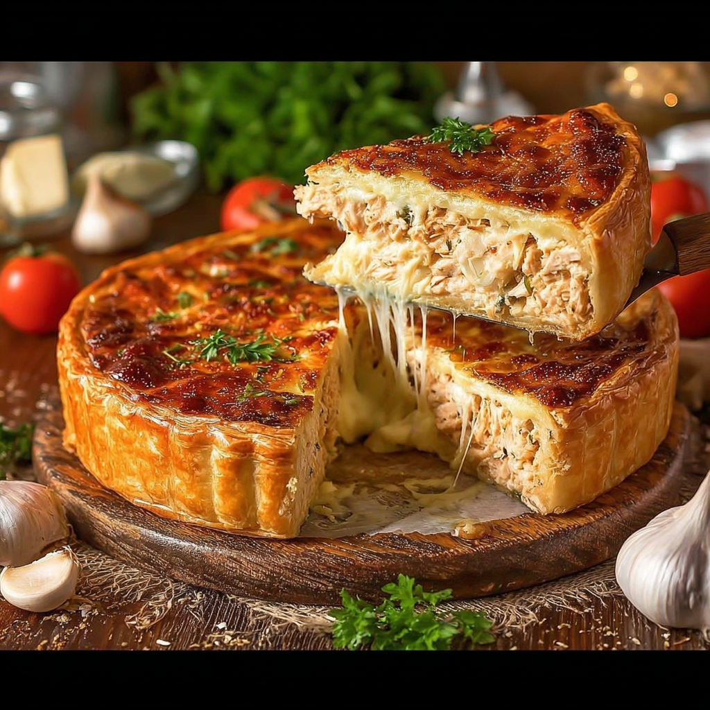 La photo présente une magnifique tourte feuilletée dorée, généreusement garnie de poulet effiloché et de fromage fondant. À la découpe, on observe des filaments de fromage qui s’étirent délicatement entre la part soulevée et le reste de la tourte, révélant un intérieur moelleux et savoureux. La pâte est bien dorée, croustillante à l’extérieur et épaisse juste ce qu’il faut pour contenir une farce riche et crémeuse. L’ensemble évoque un plat convivial, réconfortant et parfaitement adapté à un repas familial.