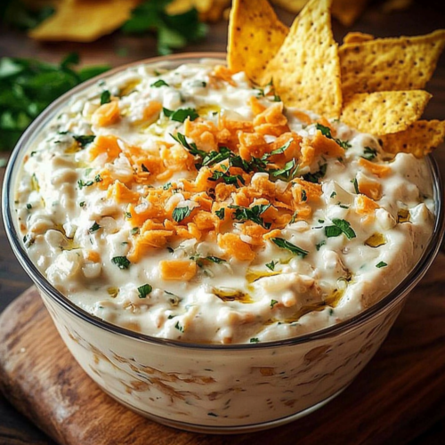 Une fois la trempette bien réfrigérée, retirez-la du réfrigérateur, mélangez-la légèrement pour homogénéiser la texture et servez-la avec des crudités, des chips keto, ou même des crackers sans gluten. Elle fera sensation à chaque occasion, que ce soit lors d’une soirée entre amis ou pendant un camping.