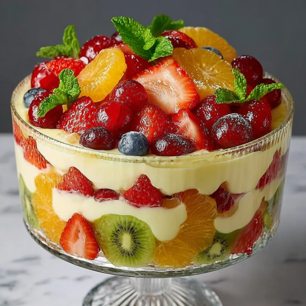 Dans cette version simple et accessible, nous utilisons une crème anglaise à la vanille, des fruits frais colorés et du gâteau type génoise pour créer un dessert visuellement attrayant et délicieux.