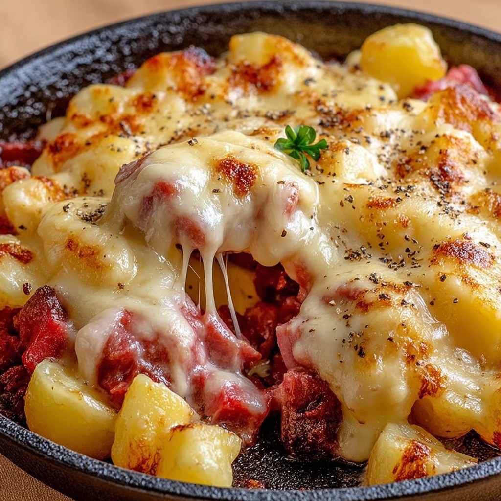 La truffade au cantal fondant est un plat traditionnel du Massif central, plus précisément de l’Auvergne, où elle est considérée comme une véritable institution culinaire. Riche, rustique et terriblement réconfortante, cette spécialité à base de pommes de terre et de fromage fondu illustre parfaitement la cuisine de terroir : simple, généreuse et conviviale. La truffade se distingue par sa texture fondante, son parfum de fromage chaud et sa croûte légèrement dorée. Servie bien chaude, souvent accompagnée d’une salade verte ou d’une charcuterie auvergnate, elle symbolise la chaleur et la gourmandise des repas montagnards.