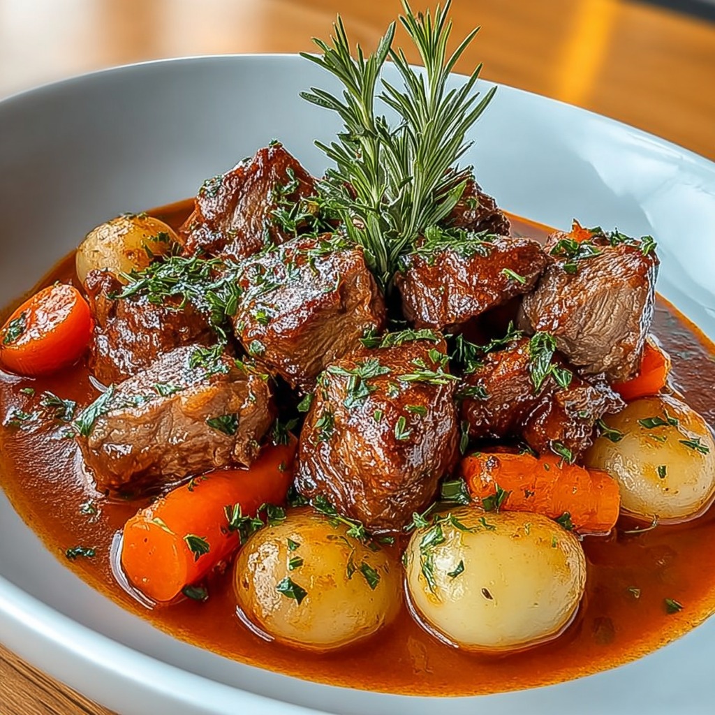 La cuisson se poursuit à feu doux pendant quarante-cinq minutes. Le mijotage lent est essentiel : il permet à la viande d’atteindre une tendreté parfaite tout en absorbant les saveurs du mélange de légumes et d’aromates. Pendant cette phase, la sauce réduit légèrement et s’épaissit, les légumes fondent, les arômes se mélangent et la viande devient extrêmement moelleuse. Le plat gagne en caractère au fil des minutes, révélant toute la douceur naturelle des tomates combinées à la profondeur aromatique du bouillon et du vin.