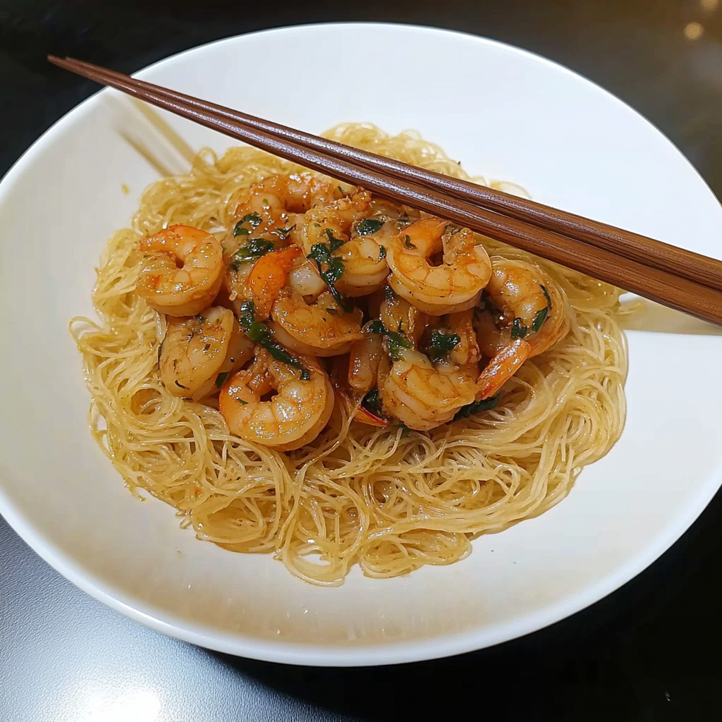 Vermicelles légers et savoureux, accompagnés de crevettes marinées, un plat frais et exotique parfait pour un repas estival.
