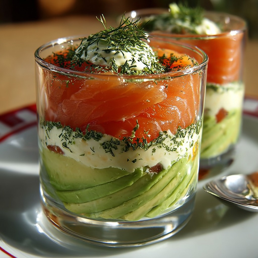On peut remplacer l’avocat par du concombre mixé pour une version plus légère et fraîche. Le saumon fumé peut être remplacé par du saumon mariné ou du saumon cuit froid. Les herbes peuvent varier entre ciboulette, coriandre ou basilic selon le goût. Chaque variante conserve la fraîcheur et l’équilibre de la verrine originale.