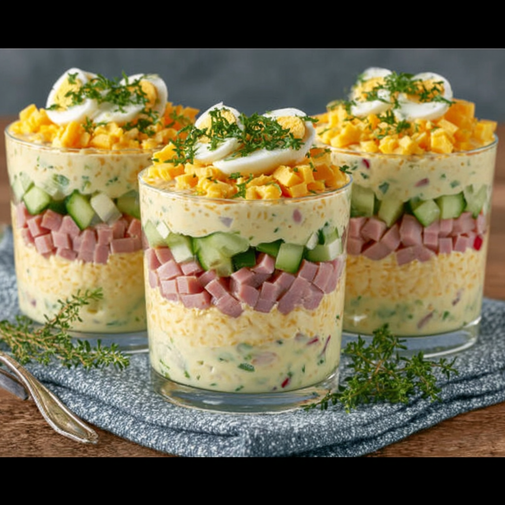 Ces verrines mimosa au jambon et œufs allient fraîcheur, onctuosité et élégance visuelle, et elles offrent une recette simple mais impressionnante, parfaite pour toutes les occasions où l’on souhaite proposer un apéritif ou une entrée raffinée.