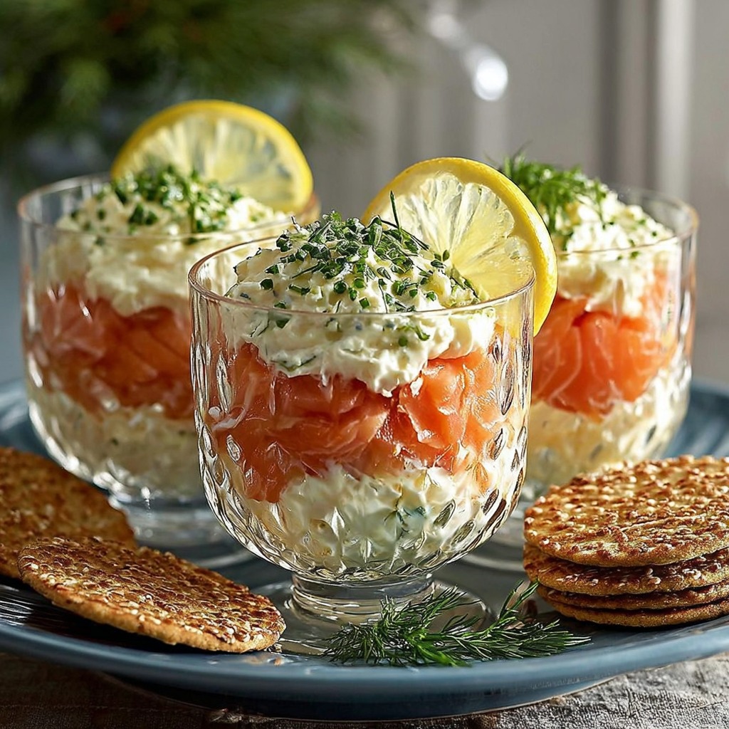 Servies en portions individuelles, ces verrines mettent en valeur la transparence du verre pour présenter les couches de fromage et de saumon de manière esthétique, créant un effet visuel appétissant et sophistiqué.