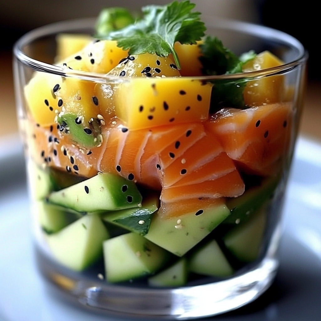 Ajoute ensuite une couche de tartare de saumon mariné, puis les dés de mangue.