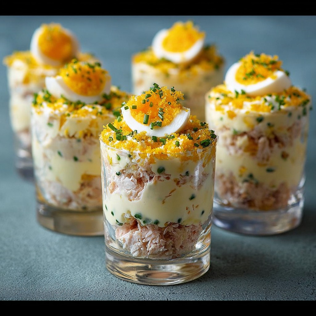 Servies en verrines ces bouchées permettent une dégustation équilibrée où chaque couche apporte une sensation différente. Le thon apporte une base douce et légèrement iodée les œufs mimosa offrent une texture fondante et gourmande tandis que la mayonnaise assure le liant et la rondeur de l’ensemble. Cette entrée séduit par sa simplicité maîtrisée et sa rapidité d’exécution.