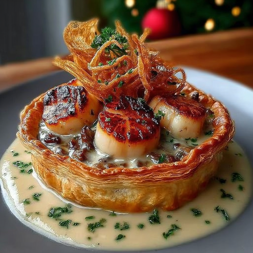 Le vol-au-vent aux Saint-Jacques, topinambour et chips de salsifis est une véritable expérience culinaire. Chaque bouchée offre un contraste subtil entre le fondant des Saint-Jacques, la douceur de la purée et le croquant des chips.