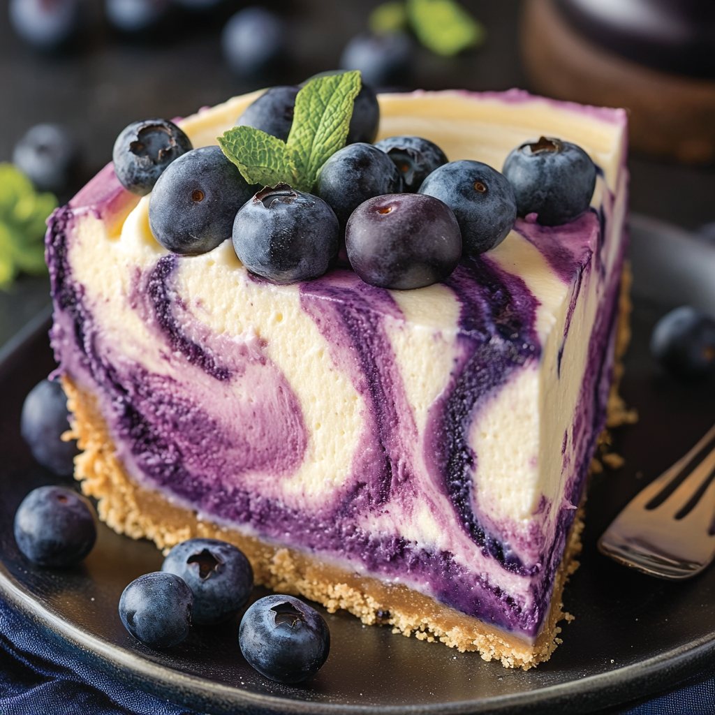 Pour half of the cheesecake batter over the prepared crust in the springform pan. Drop spoonfuls of blueberry puree onto the batter. Using a knife, gently swirl the blueberry puree into the batter to create a marbled effect. Repeat the process with the remaining batter and blueberry puree, adding more swirls to enhance the visual appeal. - Bake: