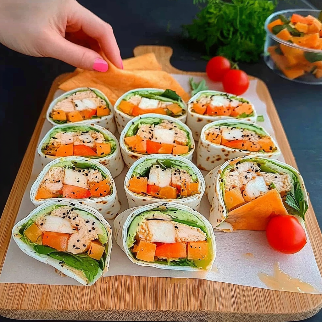 À l’aide d’un couteau très tranchant, découpez chaque wrap en bouchées de 2 à 3 cm.