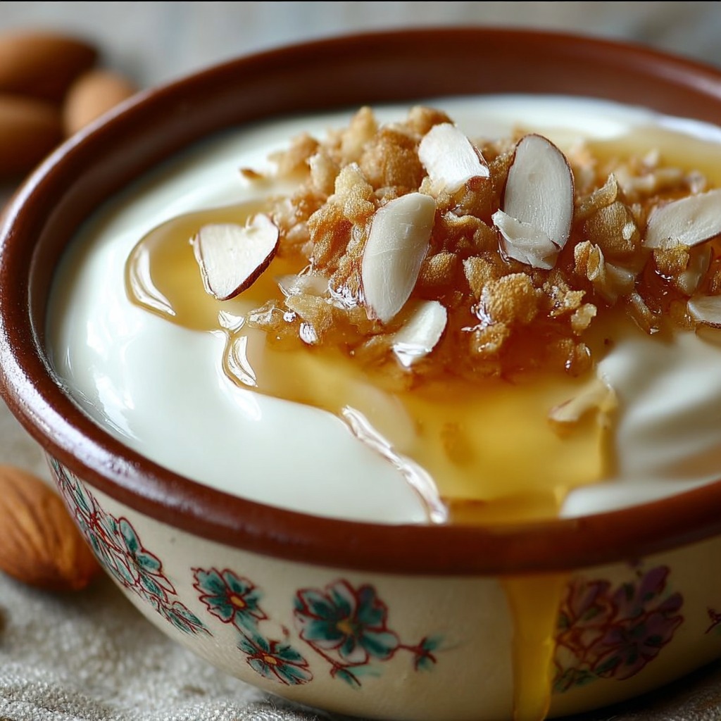 Le succès de cette recette repose sur l’équilibre. Le yaourt apporte fraîcheur et douceur lactée, le miel ajoute une note sucrée naturelle, et les amandes offrent une résistance croquante. Aucun ingrédient ne doit dominer les autres. Cet équilibre rend le dessert agréable et facile à apprécier, même après un repas copieux.
